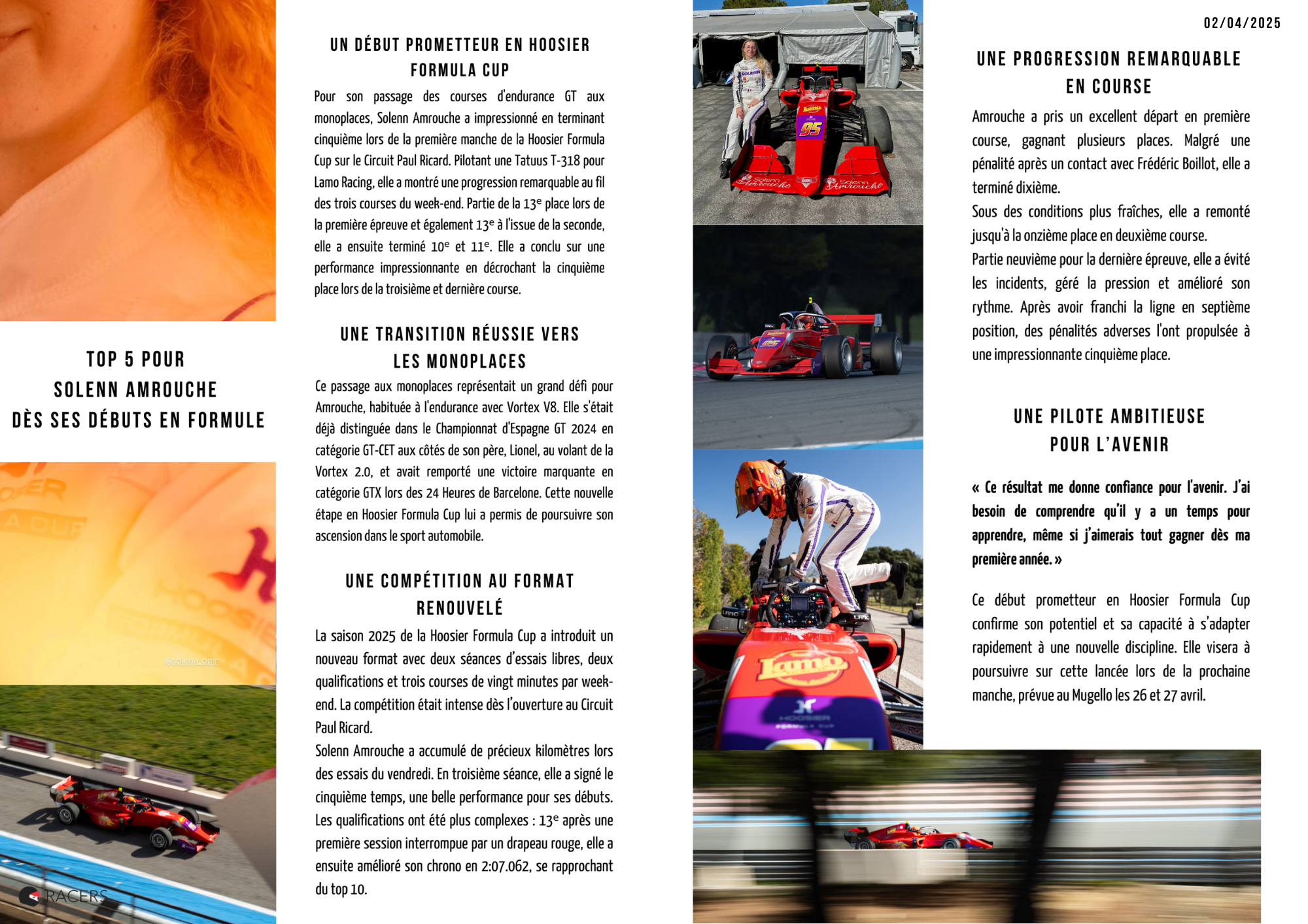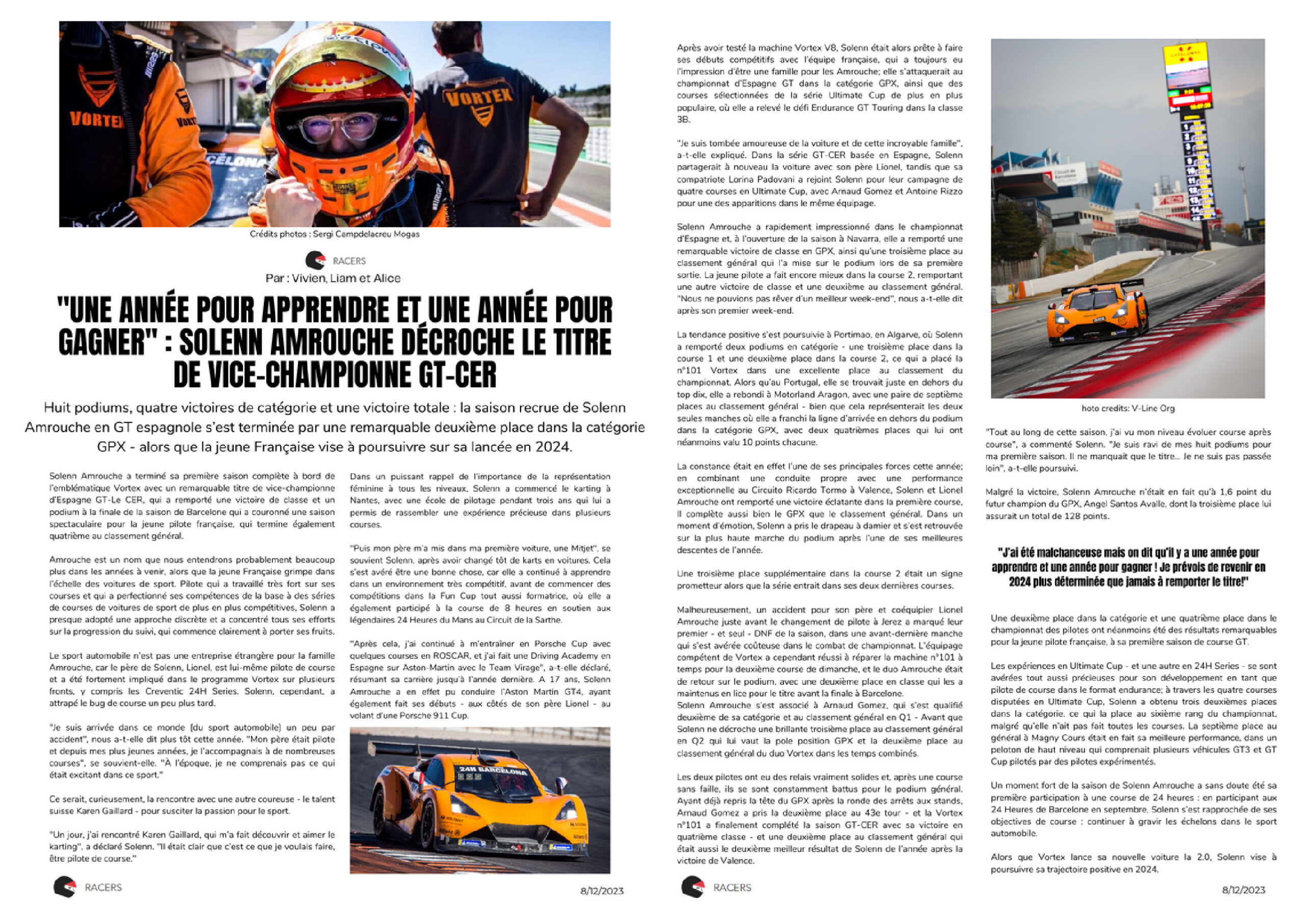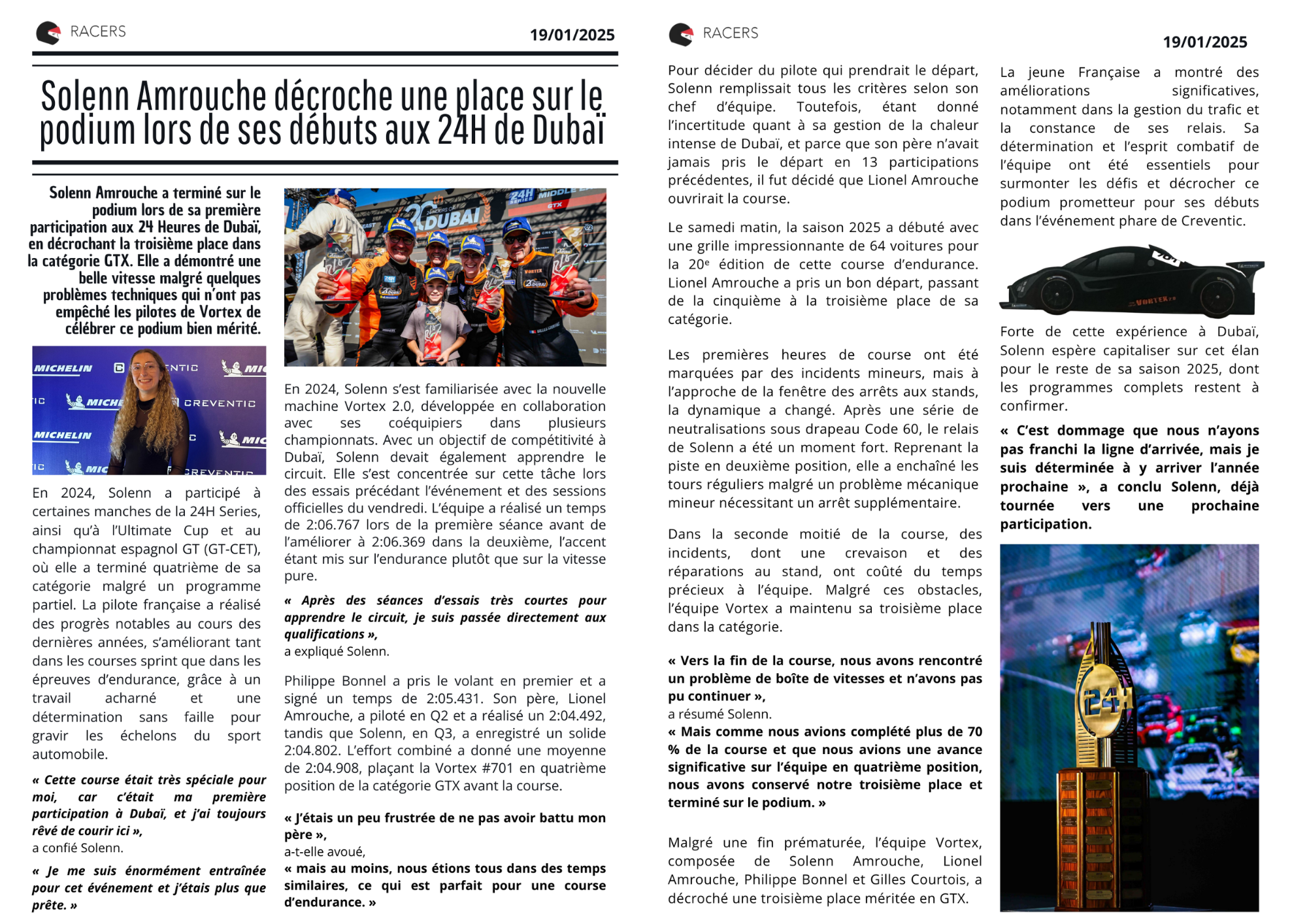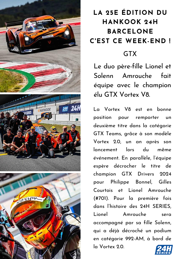 En 2023, j’ai eu la chance de rouler aux côtés de mon père, Lionel Amrouche, et de décrocher le titre de Vice-Championne d’Espagne GPX. En 2024, j’ai contribué au développement de leur nouvelle voiture, ce qui m’a permis d’affiner mon pilotage et de mieux comprendre les réglages. J’ai aussi découvert l’endurance avec mes premières courses de 24 heures, en disputant deux fois les 24H de Barcelone et une fois les 24H de Dubaï.