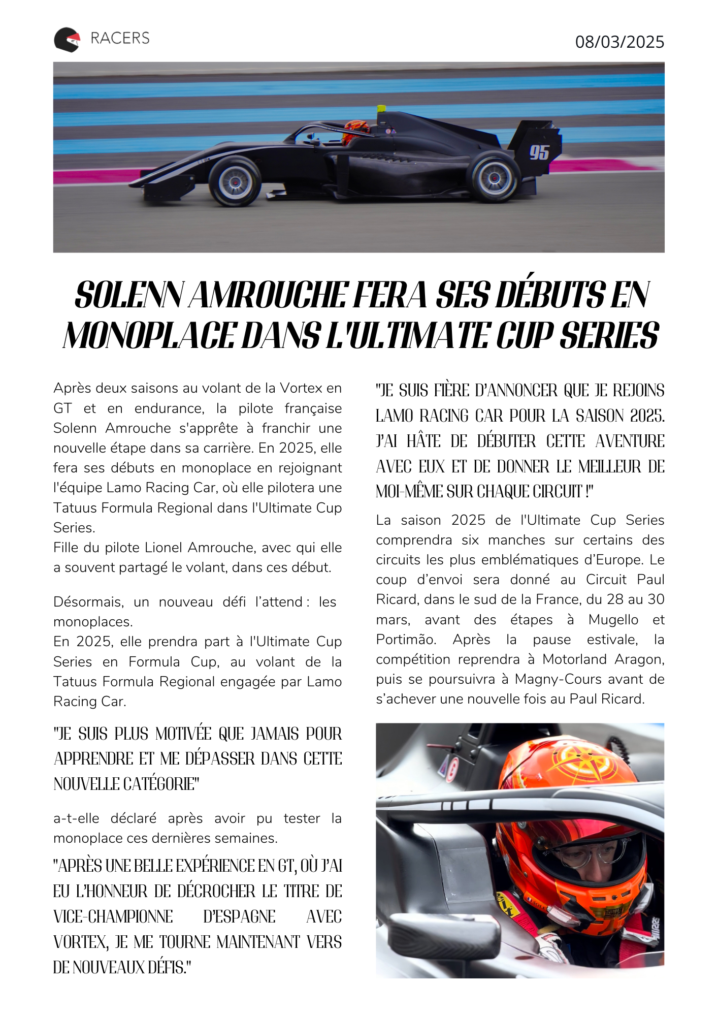 Pour la saison 2025, je suis fier de rejoindre LAMO Racing Car et de m’engager dans le championnat Ultimate Cup Series en catégorie monoplace F3R. Cette étape marque une progression importante dans ma carrière, avec pour objectif d’affiner mon pilotage dans une discipline qui constitue la base de l’apprentissage pour les jeunes pilotes.