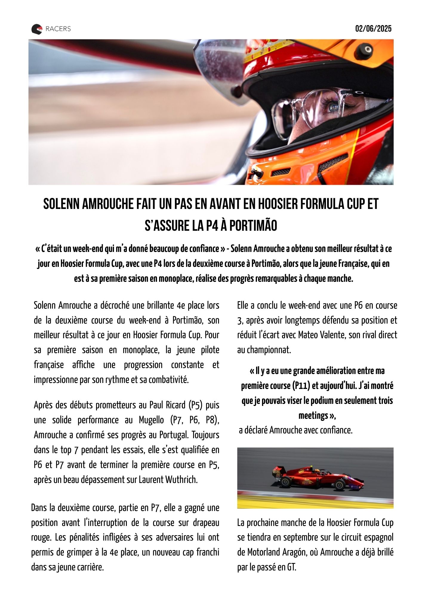 Grâce à cette expérience précieuse, je pourrai continuer à évoluer vers des catégories supérieures et poursuivre mon développement en vue des plus hauts niveaux du sport automobile.